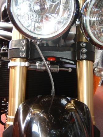 Kit amortisseur de direction avec fixations, prêt au montage, avec positionnement en-dessous du compteur.